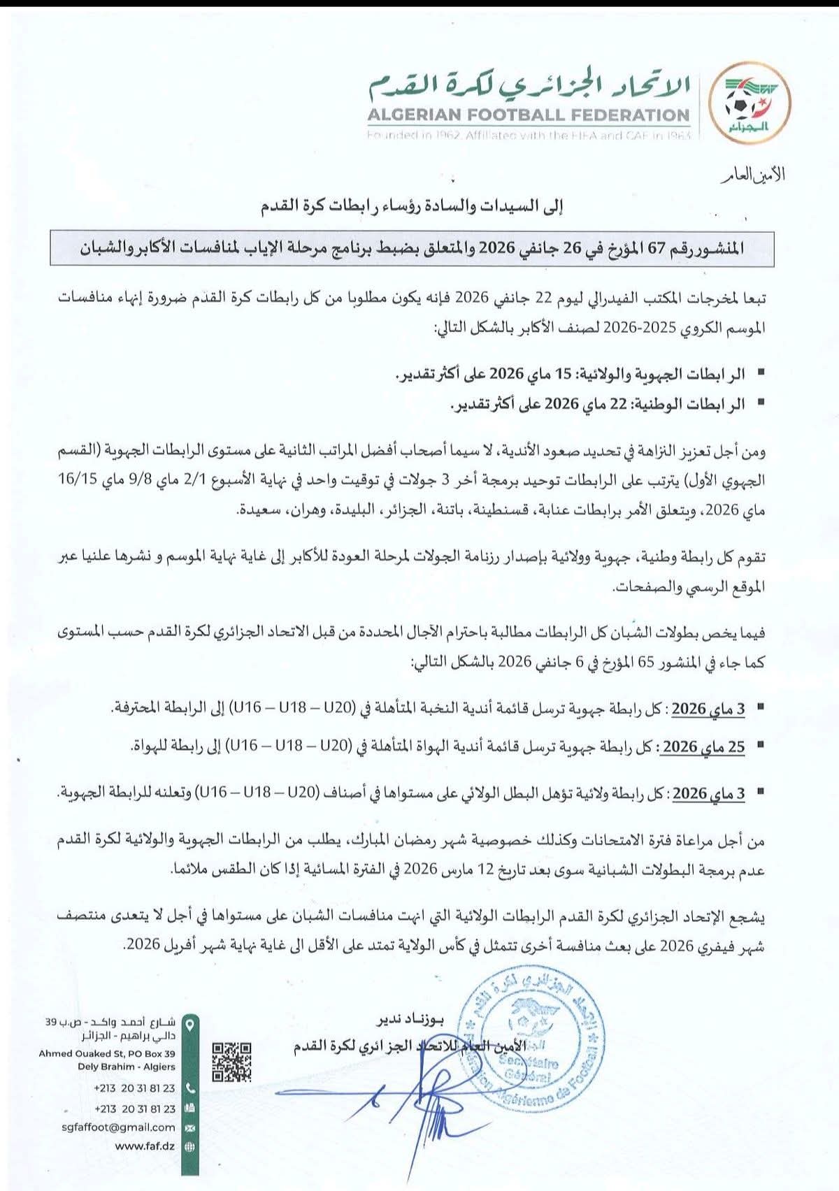 المنشور رقم 67 المتعلق بضبط برمجة مرحلة الاياب