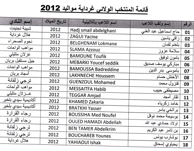 | دعوة منتخب غرداية 2012 |